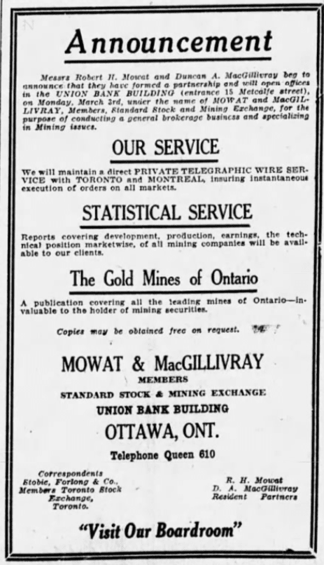Two Ottawa residents, Robert Mowat and his friend Duncan MacGillivray, decided to open their own brokerage firm in 1924. Their firm had a narrow focus, dealing exclusively with mining company stocks. Besides stocks, Mowat and MacGillivray’s company provided clients with statistical services, published information on industrial company successes in their journal, and distributed it to clients.